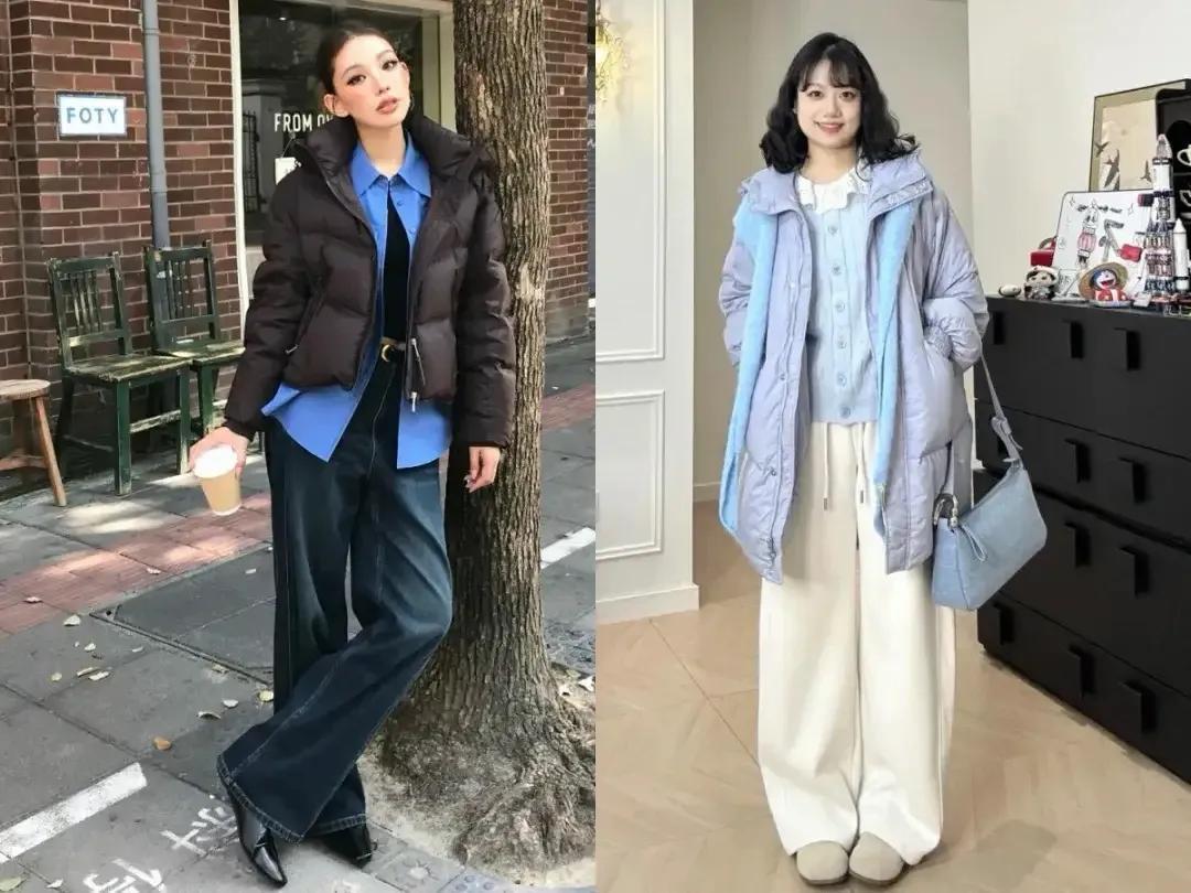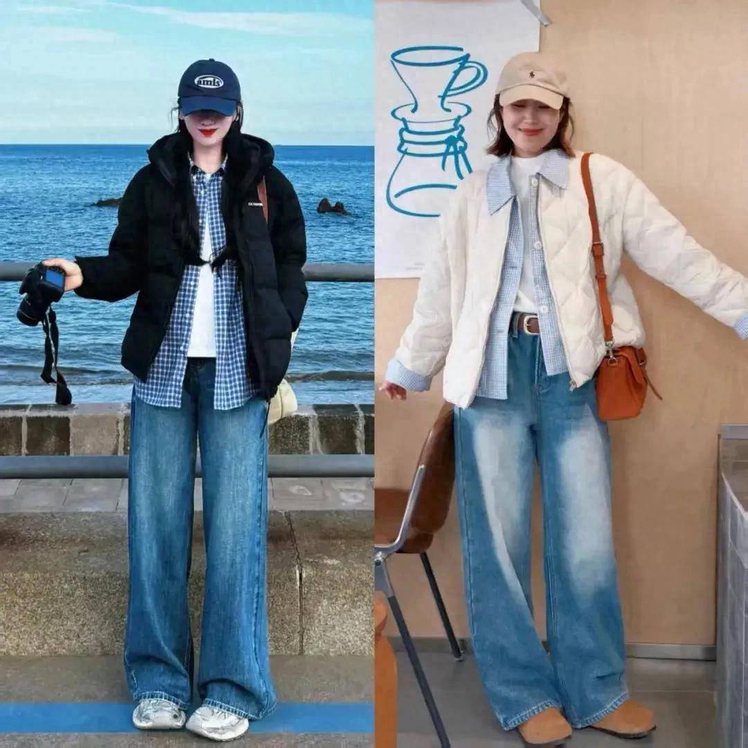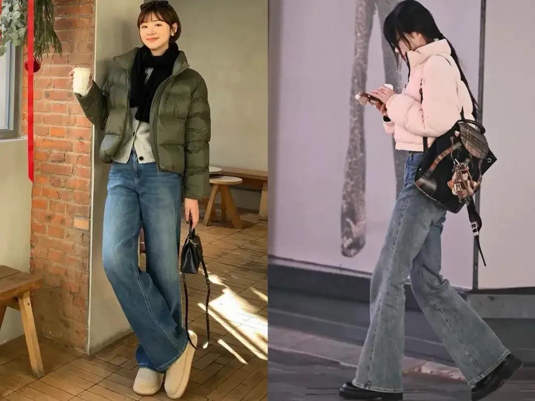 第二章节,阔腿裤搭配羽绒服,慵懒即兴Tips①:牛仔直筒阔腿裤
