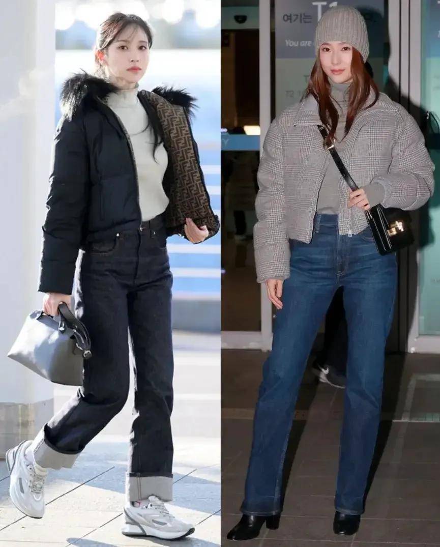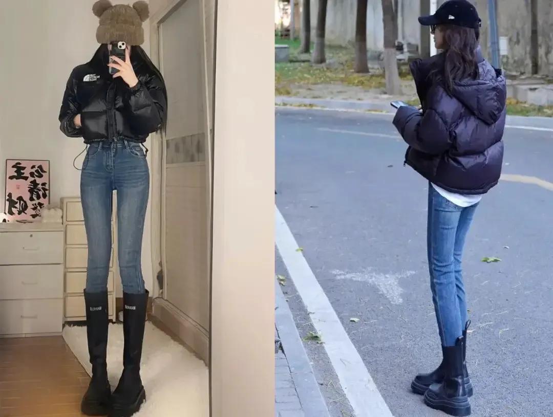 第三章节:羽绒服搭配紧身裤更显躯壳Tips①:玄色微喇叭裤 VS 牛仔紧身裤